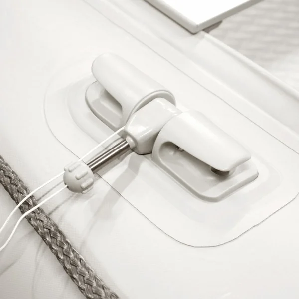 Pour garantir une résistance maximale à la corrosion en milieu marin, tous les éléments métalliques présents à bord — visserie, anneaux de remorquage, pontets ou encore supports de rames — sont fabriqués en inox (acier inoxydable) de haute qualité. Ce choix de matériaux assure une longévité exceptionnelle, même en usage intensif et prolongé en eau salée, sans rouille ni entretien particulier.