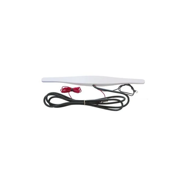 L’antenne est moulée dans boîtier en ABS blanc d’une longueur 32 cm x largeur 3,2 cm. Terminée par une priseRCA mâle en laiton chromé et par un câble coaxial 75 ohms de 150 cm de longueur. Alimentation en 12Vcc par l’intermédiaire de 2 câbles repérés : rouge pour le 12Vcc d’une longueur de 150 cm et d’un fil noir terlminé par un oeillet d’une longueur de 50cm.