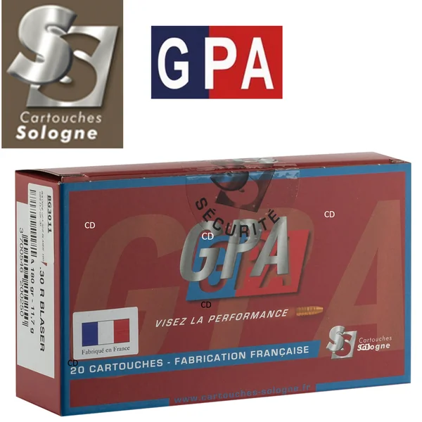 BALLES SOLOGNE GPA 30R BLASER 180 GRAINS PAR 20 :Caractéristiques :-Munitions françaises à balle monobloc (GPA) spécialement étudié pour les gibiers les plus résistants.-La garantie dune pénétration optimale et dun important effet de choc.-Ce qui caractérise le plus la balle GPA est sans aucun doute son efficacité.-Cette balle peut être présentée comme une balle à fragmentation programmée.-La compression de fluide dans le canal central provoque, dans un premier temps, une déformation de la partie avant (champignonnage) qui triple le diamètre nominal du projectile, puis, uniquement sous leffet de la résistance, se produit la séparation des pétales.-Boîte de 20 balles.*Caractéristiques Techniques :-Calibre : 30R Blaser.-Grains : 180.-Poids : 11,7g.-Type dogive : GPA.-Energie en joules : 4165.-Vitesse en m/s : 845.*MUNITIONS SOUMISES A LA LEGISLATION : Carte d’identité + Permis de chasse OU Licence de tir valides OBLIGATOIRES.*AUCUNE LIVRAISON NE POURRA INTERVENIR SANS PIECES JUSTIFICATIVES.