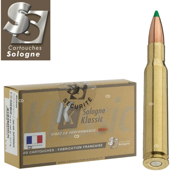 BALLES SOLOGNE KLASSIC 30-06 SPRG 180 GRAINS PAR 20 :Caractéristiques :-Depuis plus de 15 ans cartouches Sologne propose, pour le plus grand plaisir des chasseurs, des munitions de grande chasse rigoureusement précises et régulières.-Ces caractéristiques font de vos munitions votre meilleur allié pour vos plus belles parties de chasse.-Boîte de 20 balles.*Caractéristiques Techniques :-Calibre : 30-06 Sprg.-Grains : 180.-Poids : 11,7g.-Type dogive : Nosler Ballistic Tip.-Energie en joules : 3733.-Vitesse en m/s : 800.*MUNITIONS SOUMISES A LA LEGISLATION : Carte d’identité + Permis de chasse OU Licence de tir valides OBLIGATOIRES.*AUCUNE LIVRAISON NE POURRA INTERVENIR SANS PIECES JUSTIFICATIVES.