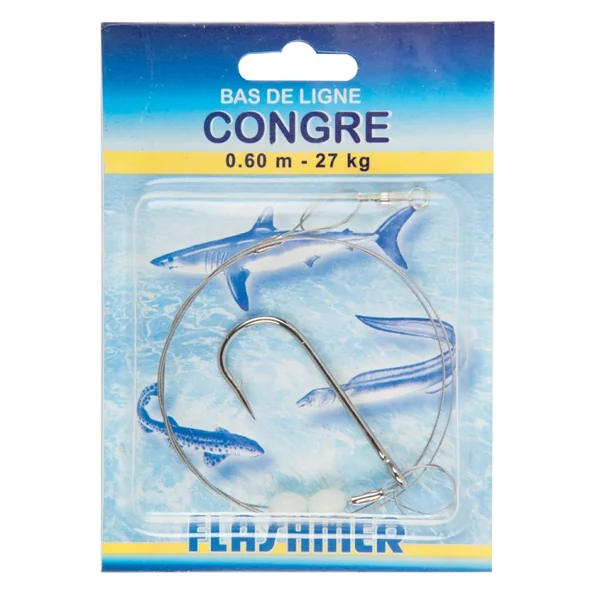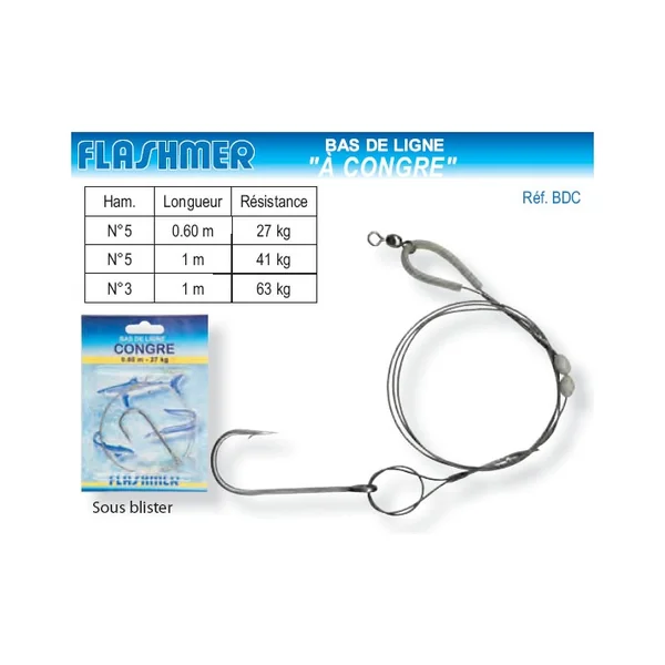 | Bas de ligne à Congre | N°5 > 0.60 m > 27 kg N°5 > 1 m > 41 kg N°3 > 1 m > 63 kg |