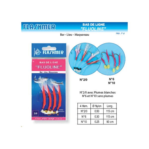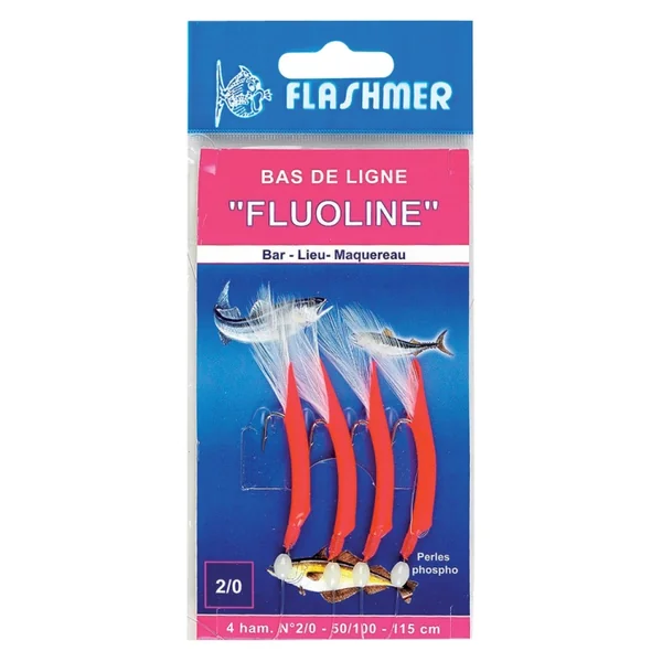 Bas de Ligne Flashmer Fluoline 4 Ham. Les montages Fluoline sont conçus pour pêcher les lieus, bonites et bars. 4 hameçons montés sur Nylon avec tubes fluos rouge , plumes blanches et perles phosphos.