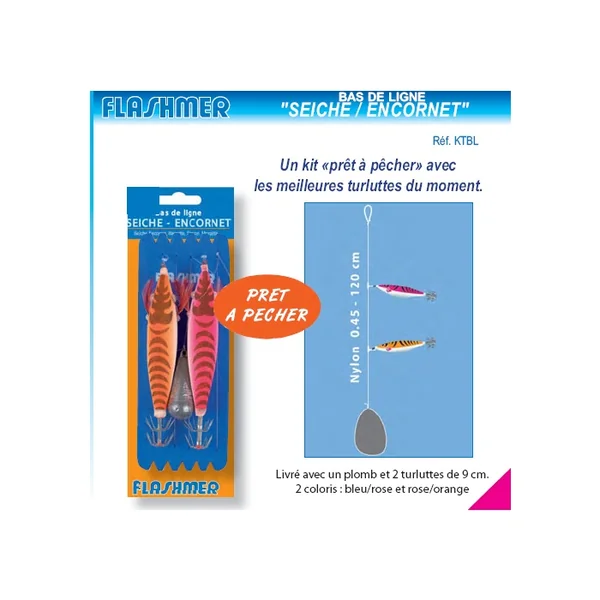 Bas de ligne Flashmer Seiche/Encornet Un kit «prêt à pêcher» avec les meilleures turluttes du moment.