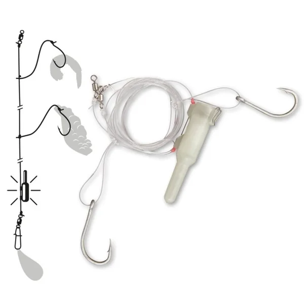 Bas de ligne grand fond Zebco avec lampe Deux hameçons n° 7/0 pour placer des morceaux de poissons ou une crevette, une lampe très visible une fois qu’elle touche l’eau, corps de ligne en 0.8 mm, bas de ligne en 0.8 mm 40 kg.