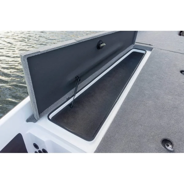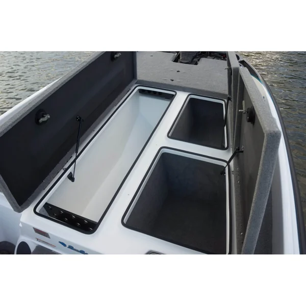 Parmi les nombreux détails pensés pour les pêcheurs, les coffres du pont avant sont conçus de manière à pouvoir s’ouvrir sans risquer de faire tomber une canne à l’eau. Le pont, quant à lui, mesure un impressionnant 2,30 m de long, offrant tout l’espace nécessaire pour pêcher en toute aisance. Même l’emplacement des sondeurs et de la pédale du moteur électrique a été optimisé pour maximiser l’espace disponible.