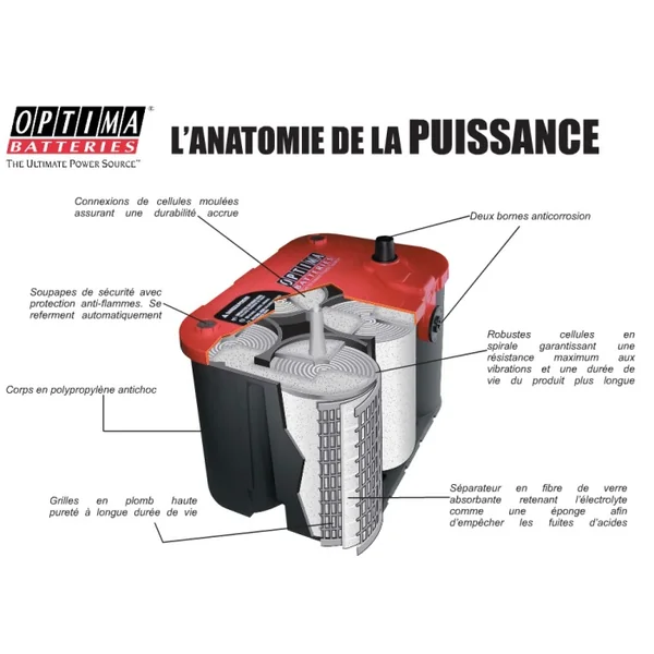 Les batteries OPTIMA sont des batteries très avancées techniquement : il s’agit d’une batterie AGM (l’acide est imbibé dans la fibre de verre) avec des éléments enroulés (technologie Spiralcell). Cette batterie est sans entretien, 100% étanche (elle ne contient pas d’acide liquide), très résistante aux vibrations et surtout elle bénéficie d’un ratio volume / poids / puissance exceptionnel pour une batterie au plomb.