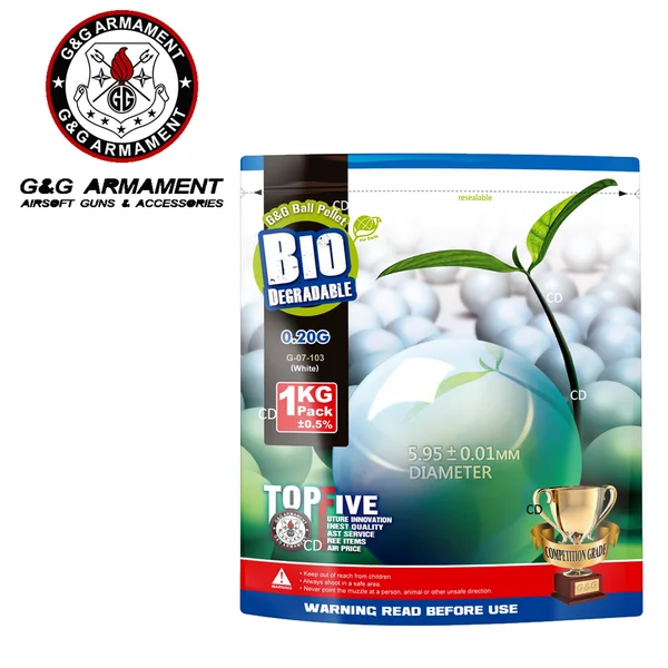 BILLES G&G ARMAMENT BIO BLANCHES 1KG 0.20G :Caractéristiques :-Billes, de marque G&G Armament, en sachet de 1Kg.-Billes Biodégradables.-Billes plus lourdes et plus stables pour le tir longue distance type sniper.-Sachet de 1Kg, biodégradable.-Calibre Exact : 5,95mm.-Tolérance : +/- 0.01mm.-Contenance : 5000 billes.-Poids : 0.20g. -Billes parfaitement sphériques.*DANGEREUX ! Respecter les précautions d’emploi.