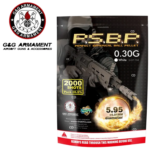BILLES G&G ARMAMENT PERFECT GRISES 0.30G PAR 2000 :Caractéristiques :-Billes, de marque G&G Armament, en sachet de 2000.-Billes Perfect Spherical Ball Pellet.-Sachet de 2000 billes.-Calibre Exact : 5,95mm.-Tolérance : +/- 0.01mm.-Contenance : 2000 billes.-Poids : 0.30g.-Calibre 6mm Airsoft.-Coloris : Gris. (Gris clair, Blanc) -Billes parfaitement sphériques.*DANGEREUX ! Respecter les précautions d’emploi.