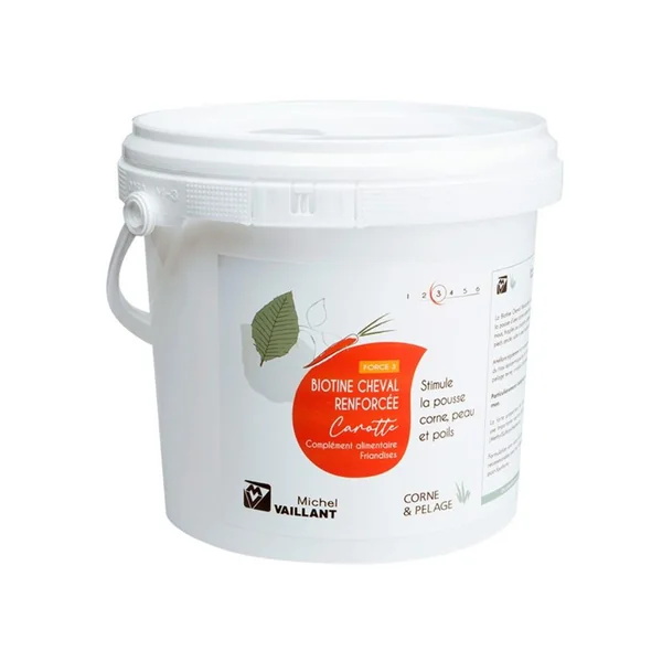 Biotine Renforcée Carottes Force 3 est un complément alimentaire hautement concentré en biotine pure (vitamine B8), minéraux et luzerne, formulé pour stimuler la pousse d’une corne saine et renforcer la qualité de la peau, du poil et des tissus épidermiques. Présenté sous forme de granulés très appétents aromatisés à la pomme, ce supplément est idéal pour les chevaux souffrant de sabots mous, fragiles ou cassants, de seimes, fourmilières, ou encore de pieds cerclés suite à une fourbure. Favorise une pousse saine et résistante du sabot Renforce les tissus épidermiques (peau, poil, crinière) Lutte contre la déminéralisation grâce à l’apport de MSM, calcium et oligo-éléments Vertus antioxydantes pour un soutien global du métabolisme Indispensable pour les poulains en croissance, les juments gestantes et les chevaux âgés Chevaux aux sabots endommagés ou à la corne fragilisée Animaux en période de mue ou au poil terne Poulains en croissance, poulinières en fin de gestation Suivi nutritionnel des chevaux âgés La vitamine B8 (biotine) joue un rôle fondamental dans la synthèse des kératines, indispensables à la santé de la corne, de la peau et du poil. Ce complément assure un apport optimal, sans risque, même pendant la gestation, et contribue au développement harmonieux du poulain dès le 6e mois de la jument. Conditions d’utilisation : Dose journalière pour 1 cheval de 500 kg 15g/jour soit un apport de 22,5mg de biotine pure = 3 à 5 friandises correspondant à une longueur d’environ 6 cm. Administrer quotidiennement, mélangé à la ration Posologie à adapter en fonction du poids et des besoins du cheval Cure recommandée de 6 à 12 semaines, renouvelable si nécessaire