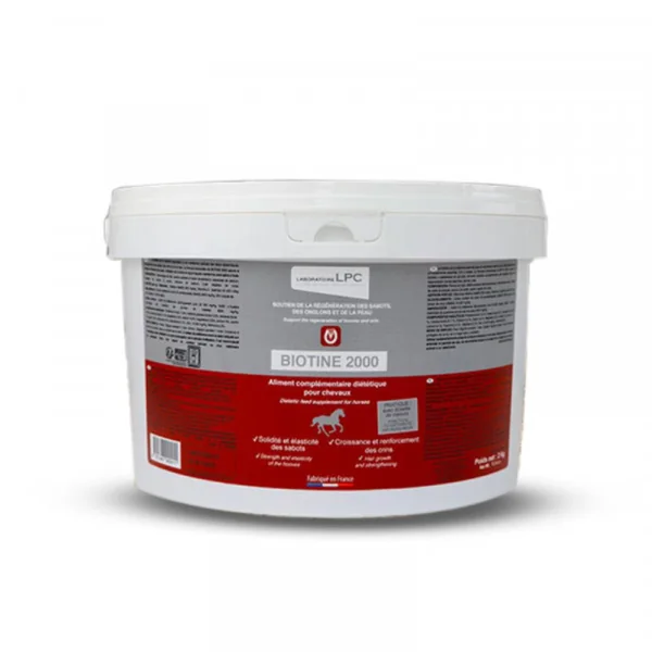 La Biotine 2000 est un complément alimentaire très concentré en biotine (vitamine B8), associée à du zinc et de l’acide folique, qui soutient la croissance, la solidité et l’élasticité de la corne. Elle apporte également un support nutritionnel précieux pour des crins plus résistants et une robe éclatante. Sabots renforcés et plus résistants Robe plus brillante, crins denses et solides Équilibre structurel optimal pour la fonction amortisseur du pied, essentiel pour la performance du cheval Conditions d’utilisation : Chevaux : 50g / jour pendant 1 mois