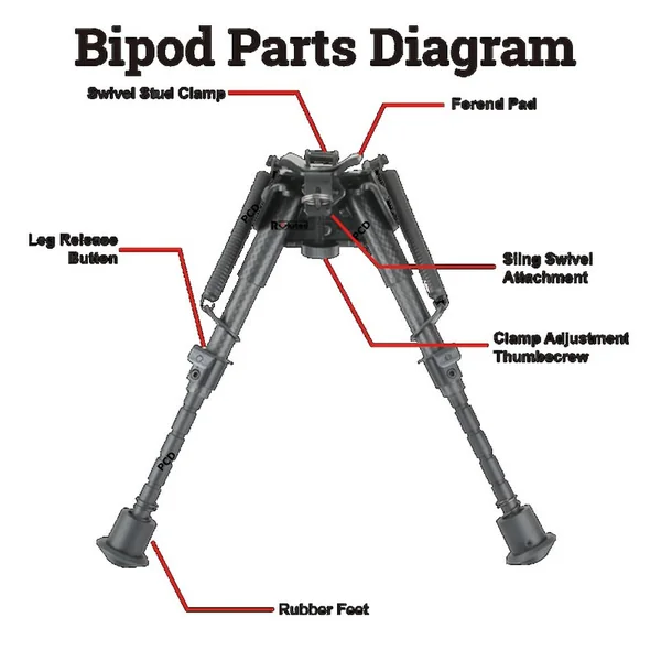 Bipied à ressorts, en fibre de carbone, polyvalent et stable grâce à ses pieds en caoutchouc qui lui permettent de s’adapter à tous les types de terrains.