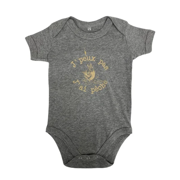 Le body gris Jpeux pas j’ai pêche pour bébé de la marque Bartavel est arboré d’un dessin de pêche et de la phrase « j’peux pas j’ai pêche ».