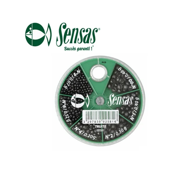 Boîte de plombs distributrice, de marque Sensas, qui rassemble les plombs les plus utilisés pour pêcher les truites.