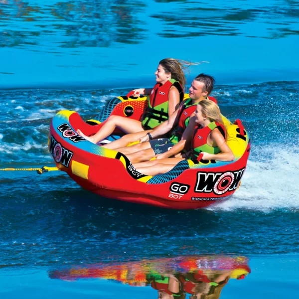 Bouée Tractée 3 personnes Wow Go Bot Glissez sur l’eau avec le Go Bot de WOW. Conçu pour le plaisir entre ami en ou en famille, le Go Bot est idéal pour les plus jeunes comme pour les plus âgés. Que ce soit en position assise à partir du point de remorquage avant ou à genoux grâce au point de remorquage arrière, la Go Bot saura vous satisfaire. La profondeur des sièges et le dossier élevé permettent aux passagers de se sentir plus en sécurité. Le nouveau système d’entrée EZ à fentes facilite plus que jamais le retour sur la bouée pour les passagers perdus en route. Le Go Bot sera aimé de tous les membres de la famille, de ceux qui veulent un tour facile et agréable à ceux qui veulent quelque chose de plus extrême.