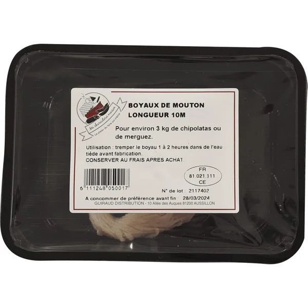 Composition : 100% boyau naturel de mouton. Longueur : environ 10 m soit environ 3 kg de préparation. À conserver au frais. Utilisation : chipolatas, merguez. Mode d'emploi : 4 heures avant de les utiliser, trempez les boyaux dans un premier bain d'eau froide pour les dessaler puis laissez les tremper dans un bain d'eau tiède pour que la texture soit plus souple.