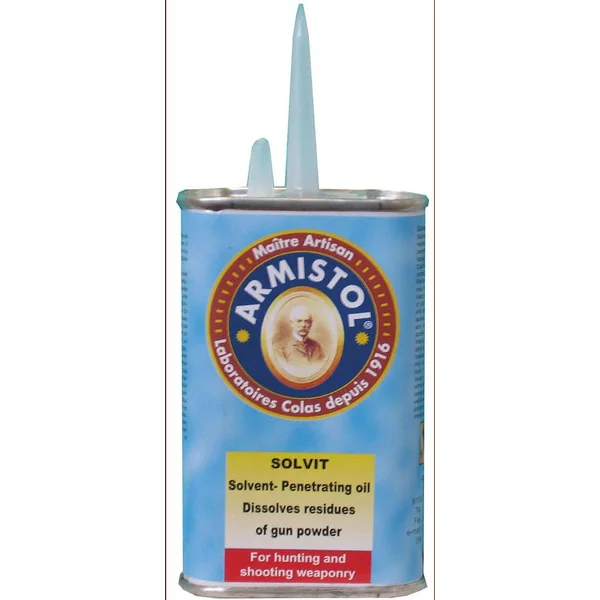 Burette de Solvant et dégrippant, particulièrement étudié pour dissoudre les résidus de poudre noire, il a aussi une action pour le désemplombage des canons.