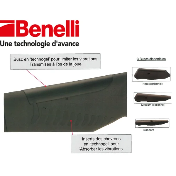 Busc interchangeable, en TECHNOGEL, pour le remplacement de celui qui était installé sur votre fusil Benelli M2 ou SBE 2, ou votre carabine Benelli Argo ou Argo E, disposant déjà du Système Progressive Comfort.