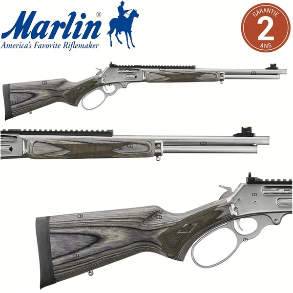 La finition en acier inoxydable poli, la crosse lamellé collé gris, la culasse polie flûtée en spirale et le canon fileté sont autant d’éléments qui contribuent à la qualité de cette carabine à levier de sous garde.