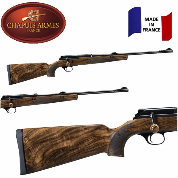 Assemblée sur une crosse monobloc à la relime ronde, caractéristique des armes Chapuis, son boîtier de culasse réalisé en alliage Fortal 7075 est enchâssé.