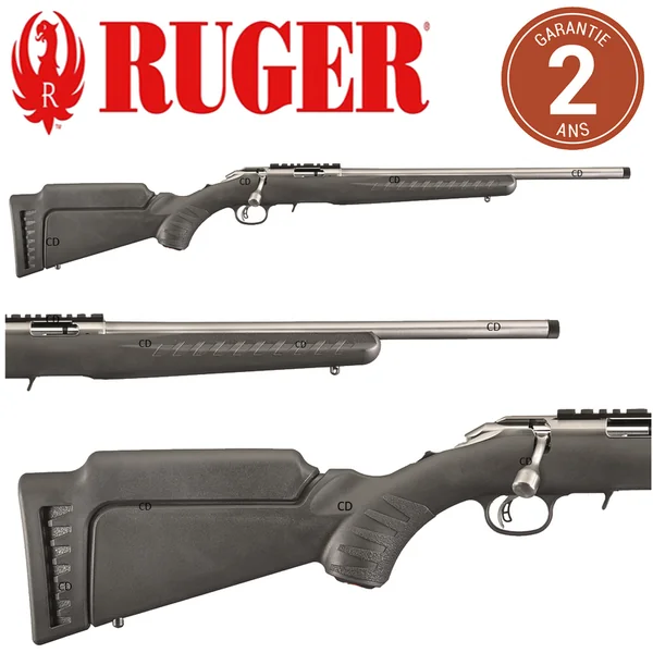 Version Inox et filetée avec canon de 46cm, de la carabine RUGER AMERICAN RIMFIRE, en calibre 22LR.