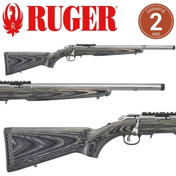 Version bois lamellé collé et filetée, avec canon de 46cm de la carabine RUGER AMERICAN RIMFIRE en calibre 22LR, finition INOX.