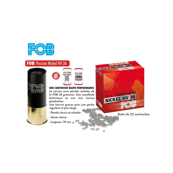 CARTOUCHES BOURRE JUPE 36G FOB PASSION NICKEL HV 36 : Caractéristiques : -Cartouches de chasse de marque FOB, avec des plombs nickelés, garantissant de hautes performances balistiques à grande distances. -Longueur : 70mm. -Culot : 16mm. -Poids : 36g. -Bourre : Jupe. -Boîte de 25 cartouches. *Disponible en N°4, N°5, N°6 et N°7. *MUNITION SOUMISE A LA LEGISLATION : Carte d’identité + Permis de chasse OU Licence de tir valides OBLIGATOIRES. *AUCUNE LIVRAISON NE POURRA INTERVENIR SANS PIECES JUSTIFICATIVES.