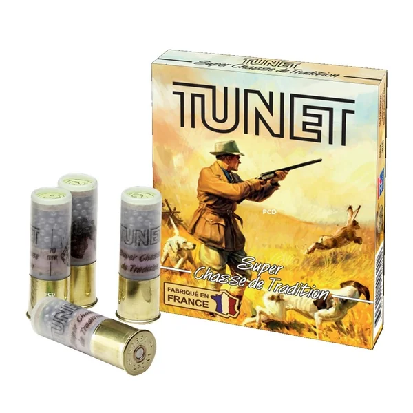 Cartouches de chasse, traditionnelles, de marque Tunet, spécialement conçues pour avoir des gerbes de plombs conséquentes mais dispersées et régulières.