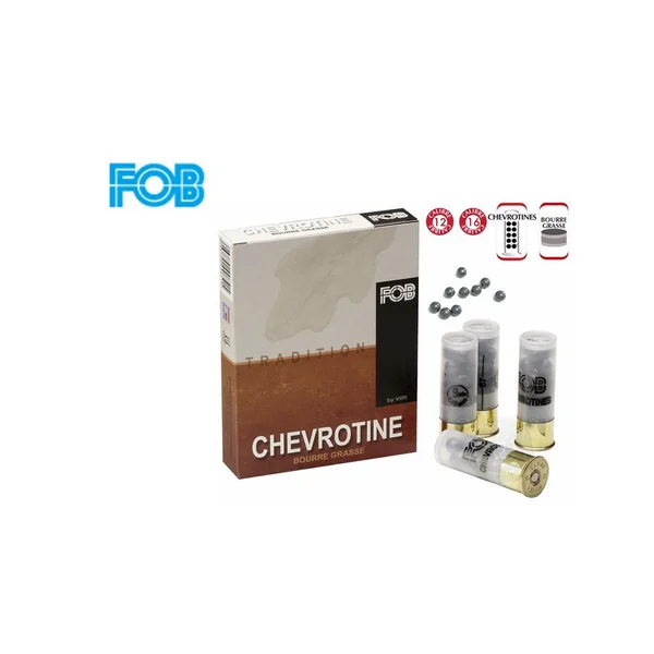 CARTOUCHES TRADITION CHEVROTINE C12 FOB 21 GRAINS : Caractéristiques : -Cartouches de chasse traditionnelles CHEVROTINE, de marque FOB. -Calibre 12, -Longueur : 67mm, -Culot : 16mm, -Bourre : GRASSE, -Sertissage : Rond, -Boîte de 10 cartouches. *Disponible en 21 grains. *MUNITION SOUMISE A LA LEGISLATION : Carte d’identité + Permis de chasse OU Licence de tir valides OBLIGATOIRES. *AUCUNE LIVRAISON NE POURRA INTERVENIR SANS PIECES JUSTIFICATIVES.