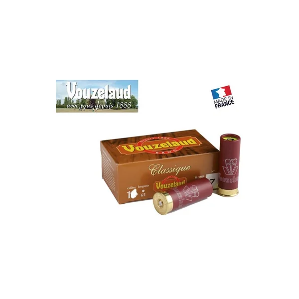 CARTOUCHES VOUZELAUD CLASSIC 24G : Caractéristiques : -CLASSIQUE Culot 8 mm, est à préférer pour ceux qui aiment la longueur 65 avec le numéro de plomb imprimé en bout et qui ne privilégient pas les grands coups de longueur.-Calibres : 20.-Chambre : 65mm.-Poids de plombs (en g) : 24g.-Hauteur du culot : 8mm.-Bourre VOUZELAUD à 2 éléments.-Fermeture : Demi ronde Liège précoupé.-N° de plombs disponible : 4, 5, 6, 7 & 8.-Bourre : Jupe. -Boîte de 10 cartouches. *MUNITION SOUMISE A LA LEGISLATION : Carte d’identité + Permis de chasse OU Licence de tir valides OBLIGATOIRES. *AUCUNE LIVRAISON NE POURRA INTERVENIR SANS PIECES JUSTIFICATIVES.