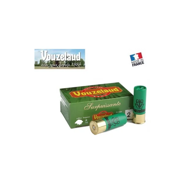 CARTOUCHES VOUZELAUD SURPUISSANTE 30G : Caractéristiques : -SURPUISSANTE, est une munition aux performances élevées.-A vitesse égale, la charge de plomb est augmentée de 7 à 13 % selon le calibre. -Son recul est plus important et doit être réservée aux fusils chambrés à 70 mm (ou 76 mm). -Elle vous donnera des résultats surprenants et particulièrement à grandes distances.-Calibres : 16-Chambre : 70 mm-Poids de plombs (en g) : 30 g,-Hauteur du culot : 16 mm-Bourre VOUZELAUD à 2 éléments,-Fermeture : Etoile-N° de plombs disponible : 1, 2, 3, 4, 5, 6, 7½, 8, 9 & 10-Bourre : grasse, -Boîte de 10 cartouches. *MUNITION SOUMISE A LA LEGISLATION : Carte d’identité + Permis de chasse OU Licence de tir valides OBLIGATOIRES. *AUCUNE LIVRAISON NE POURRA INTERVENIR SANS PIECES JUSTIFICATIVES.