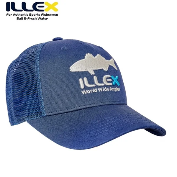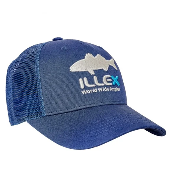 Casquette de marque ILLEX, modèle Trucker de couleur bleu royal, visière bleu royal, arrière de la casquette en ‘mesh’ filet de couleur bleu royal.