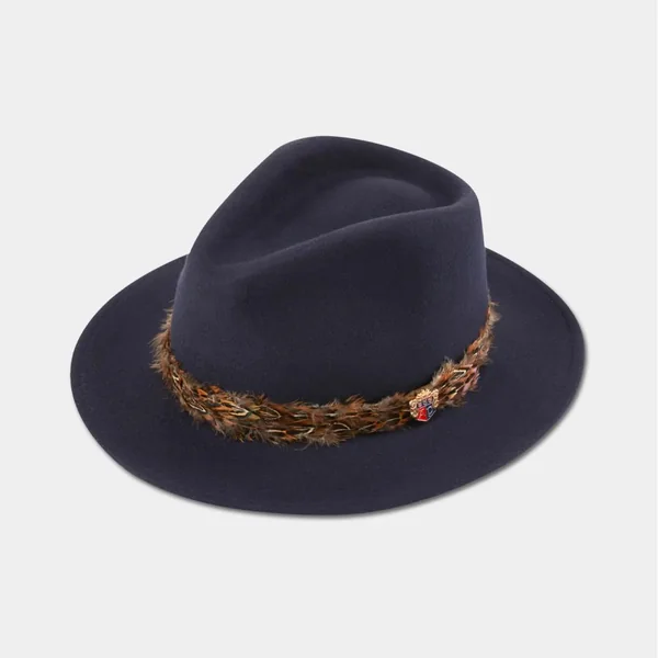 Le chapeau Ricufel de la marque Alan Paine est un chapeau pour femme de coloris bleu marine avec une couronne de plumes de faisan. Le chapeau en laine sera parfait pour vos activités extérieures comme aller à la chasse, se balader en forêt ou même pour la vie de tous les jours.