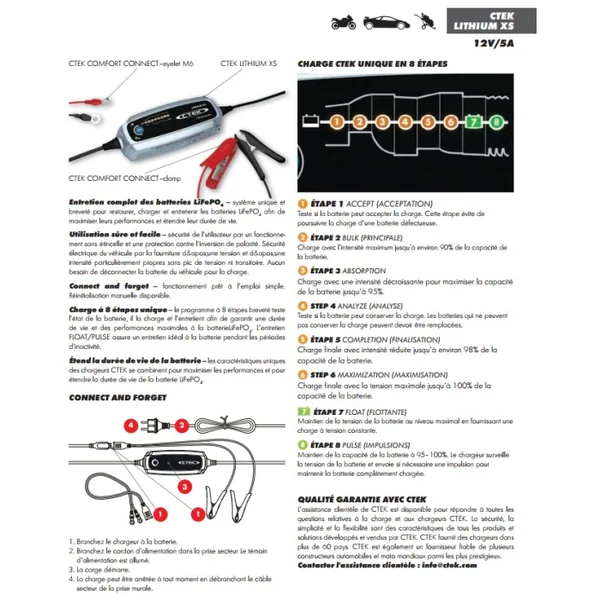 Le LITHIUM XS est un chargeur entièrement automatique « connect and forget » (brancher et oublier) à 8 étapes de charge incluant une séquence de test qui détermine si la batterie LiFePO4 peut accepter et conserver la charge, une étape de maximisation unique pour restaurer sa pleine capacité, et la charge d’entretien brevetée qui garantit les performances maximales même après des mois d’inactivité. Protégé des projections et de la poussière (IP65) le LITHIUM XS est d’un emploi facile et sûr, il protège l’électronique du véhicule, ne produit pas d’étincelle, est à l’épreuve de l’inversion de polarité et des courts-circuits. Le LITHIUM XS bénéficie d’une garantie de 5 ans. Caractéristiques Chargeur de batterie Ctek Lithium XS 12V 5A