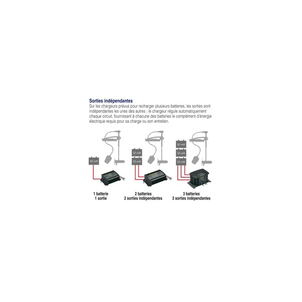 Pour 2 batteries 12V en série, choisissez un chargeur à 2 sorties afin que la charge des 2 batteries se fassent de façon homogène. De la même manière, un chargeur à 3 sorties pour 3 batteries 12V en série.
