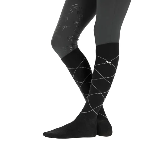 Lot de deux paires de chaussettes avec une paire à croisillons et une paire unie. Une paire en croisillon crème sur fond noir et une paire noire unie avec un liseré bleu blanc rouge.
