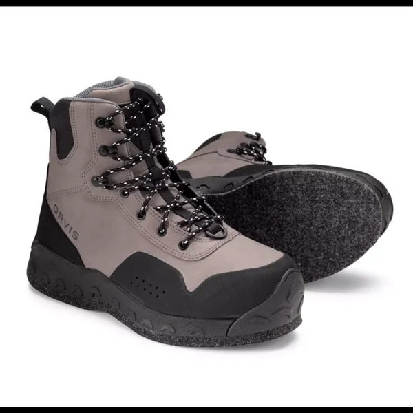 Chaussure de wading Orvis Clearwater Boots Feutre Légères, sécurisantes avec leur position haute, les chaussures Clearwater proposent deux types de semelles (caoutchouc et feutre) qui s’adaptent parfaitement à tous les fonds de nos rivières. Le cuir synthétique de qualité et la position des coutures favorisent la résistance de ce produit qui a déjà fait ses preuves.