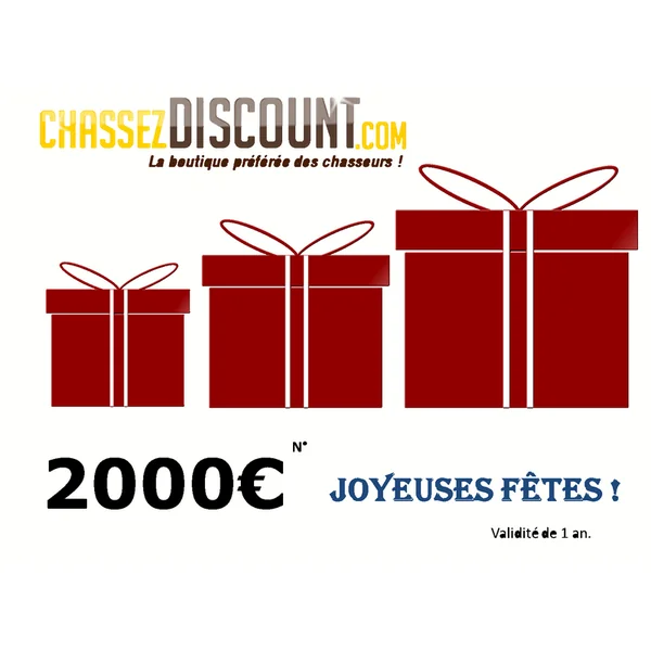 CHEQUE CADEAU 2000€ ChasseZdiscount.com :Caractéristiques :-Valable 1 an, ce chèque cadeau vous permet dêtre sûr de faire plaisir aux passionnés de chasse !-Chassezdiscount.com, c’est des centaines de références proposées à la vente en ligne qui représentent l’essentiel des produits se rapportant à notre passion !-Faîtes confiance à des gens qui pratiquent ces passions et qui savent de quoi elles parlent !-Nous avons un magasin physique et sommes conscients de l’atout que cela génère. (même si les deux activités sont indépendantes). -En effet, qui peut mieux vous conseiller que quelqu’un qui voit et teste le matériel dont vous vous servirez ..?