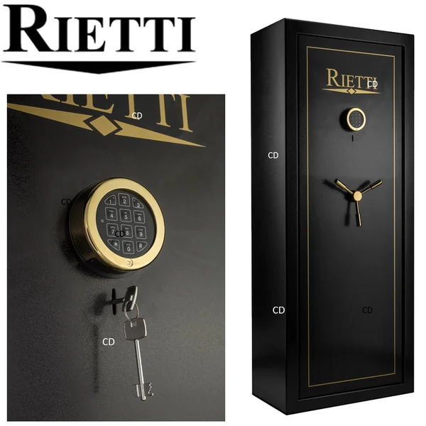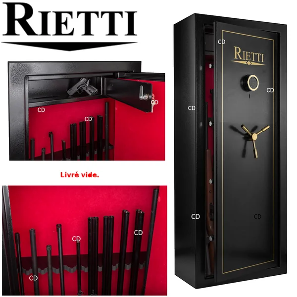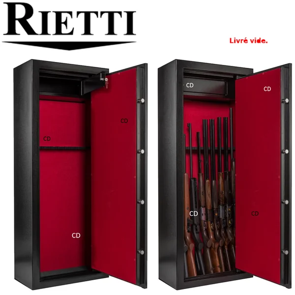 Coffre-fort, de marque Rietti, pour 10 armes longues, avec ouverture centralisée à combinaison digitale.Fabrication européenne.Serrure digitale unique avec poignée actionnant les tenons multiples.Porte épaisse.Intérieur du coffre et intérieur de la porte tapissés de moquette rouge.*Dimensions utiles grand compartiment : Hauteur de 128cm, Profondeur de 28cm et Largeur de 57cm.Petit coffre intérieur pour munitions ou objets de valeur : Hauteur de 19cm, Profondeur de 19cm et Largeur de 50cm.Râtelier en bois, gainé mousse, pour 10 fusils, dans le fond du coffre.Tous nos coffres sont livrés avec un jeu de chevilles à béton de fixation et 2 clefs de secours.Quatre pênes mobiles.Ouverture directe par combinaison ou à clef.Epaisseur porte : 3mm.Epaisseur parois : 3mm.Serrure unique.Poids : 105Kg.*Dimensions extérieures : Hauteur de 150cm, largeur de 60cm et profondeur de 33cm.*Dans le cadre de la détention d’armes de catégorie B, il est obligatoire de posséder un coffre pour maintenir les armes en question hors de portée des tierces personnes. D’une façon générale, il est fortement conseillé de mettre ses armes, quelques soient leurs catégories (B, C ou D) hors de portée des enfants et d’éventuels intrus ou voleurs en les stockant à l’abri dans un coffre pour armes. Ce coffre doit impérativement être fixé au sol ou au mur.