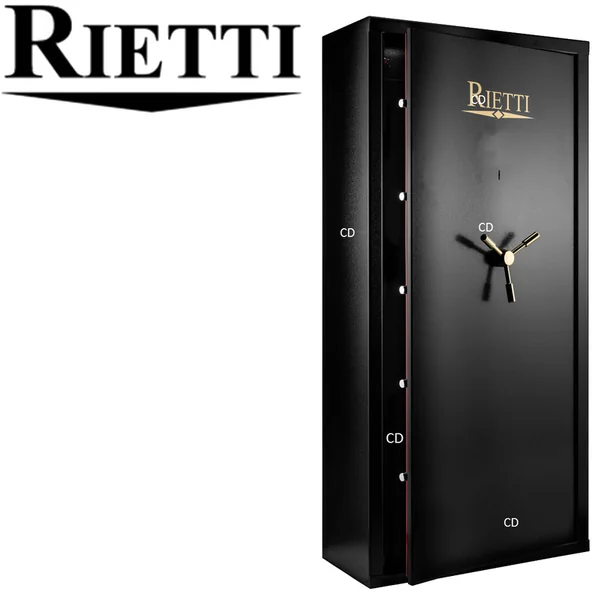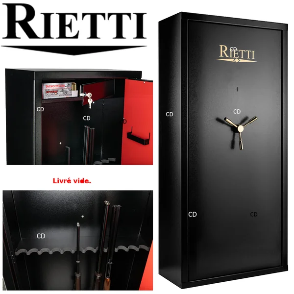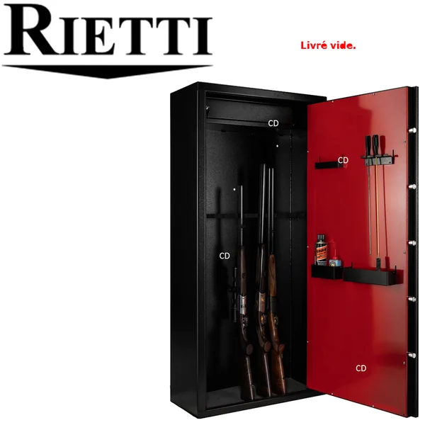 Coffre-fort, de marque Rietti, pour 12 armes longues, avec ouverture centralisée sur clef.Fabrication européenne.Serrure à clef unique avec poignée actionnant les tenons multiples.Porte épaisse.Intérieur du coffre noir.Intérieur de la porte en tôle laquée rouge.*Dimensions utiles grand compartiment : Hauteur de 128cm, Profondeur de 28cm et Largeur de 68cm.Petit coffre intérieur pour munitions ou objets de valeur : Hauteur de 19cm, Profondeur de 19cm et Largeur de 68cm.Râtelier en bois, gainé mousse, pour 12 fusils, dans le fond du coffre.Râteliers pour accessoires dans la porte.Tous nos coffres sont livrés avec un jeu de chevilles à béton de fixation et 2 clefs principales.Cinq pênes mobiles.Ouverture avec poignée à 3 branches.Epaisseur porte : 2mm.Epaisseur parois : 2mm.Serrure unique.Poids : 83Kg.*Dimensions extérieures : Hauteur de 150cm, largeur de 70cm et profondeur de 33cm.*Dans le cadre de la détention d’armes de catégorie B, il est obligatoire de posséder un coffre pour maintenir les armes en question hors de portée des tierces personnes. D’une façon générale, il est fortement conseillé de mettre ses armes, quelques soient leurs catégories (B, C ou D) hors de portée des enfants et d’éventuels intrus ou voleurs en les stockant à l’abri dans un coffre pour armes. Ce coffre doit impérativement être fixé au sol ou au mur.