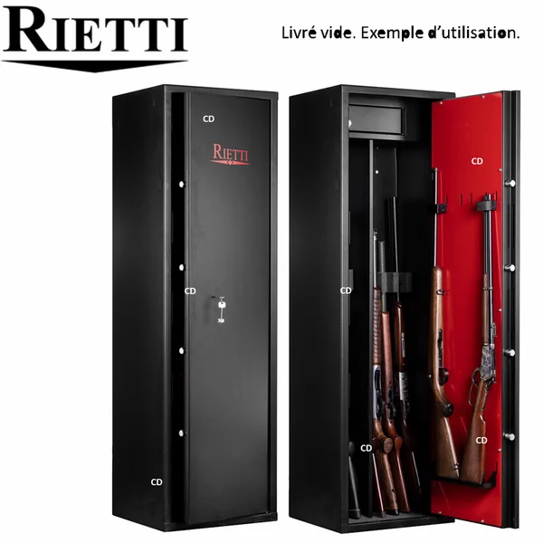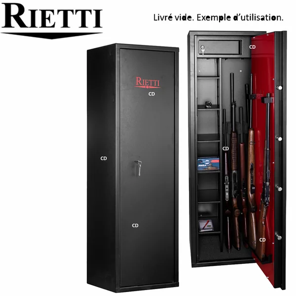 Coffre-fort modulable, de marque Rietti, avec ouverture centralisée sur clef.Fabrication européenne.Coffre-fort RIETTI modulable pour 9 armes longues ou 6 armes longues et 6 tablettes.Serrure à clef unique actionnant les tenons multiples.Porte épaisse.Intérieur du coffre noir.Intérieur de la porte en tôle laquée rouge.*Dimensions utiles grand compartiment : Hauteur de 132cm, Profondeur de 32cm et Largeur de 43.5cm.Petit coffre intérieur pour munitions ou valeurs : Hauteur de 16cm, Profondeur de 25cm et Largeur de 43,5cm.Râtelier en mousse pour 7 fusils dans le fond du coffre, logement pour 2 fusils dans la porte.Possibilité de remplacer les 3 fusils de gauche par 6 tablettes pour accessoires, valeurs…Quatre pênes mobiles.Ouverture directe avec la clef.Épaisseur porte & parois : 2mm.Serrure unique (livré avec 2 clefs)6 trous de fixation dans la paroie arrière du coffre.Livré avec 2 vis à bétons.Porte et parois en acier de 2mm.Verrouillage par 4 pênes métalliques massifs de 22mm de diamètre.Fermeture centralisée par clef unique.Intérieur en tôle noire et rouge.Support pour fusils en mousse.Coffre à munitions.Poids : 70Kg.*Dimensions extérieures : Hauteur de 150cm, largeur de 45cm et profondeur de 40cm.*Dans le cadre de la détention d’armes de catégorie B, il est obligatoire de posséder un coffre pour maintenir les armes en question hors de portée des tierces personnes. D’une façon générale, il est fortement conseillé de mettre ses armes, quelques soient leurs catégories (B, C ou D) hors de portée des enfants et d’éventuels intrus ou voleurs en les stockant à l’abri dans un coffre pour armes. Ce coffre doit impérativement être fixé au sol ou au mur.