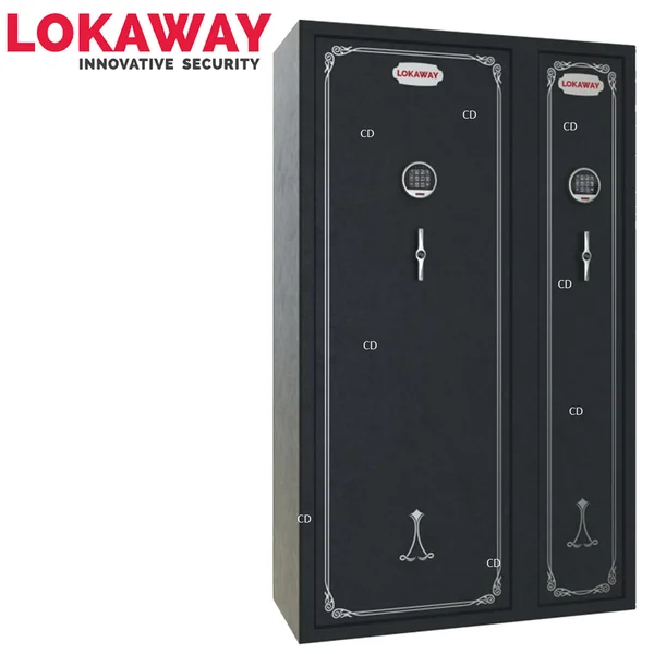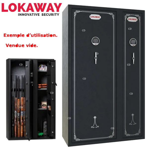 *Garantie 10 ans. (sauf partie électronique=2 ans)Conception de fermeture innovante, dissimulation des charnières, cylindres de sécurité en très grand nombre, les coffres Lokaway regroupent ces éléments simples pour faire un coffre d’une sécurité inédite. Coffre-fort Deluxe, pour 24 armes, de marque Lokaway.Equipé du système unique anti-effraction Swing’nSlide.*Voir la vidéo ! -Fermeture Digicode avec clef de sécurité fournie.-10 cylindres de 28mm.-Poignée de porte Design.-Feutrine intérieure grise.-Multiples emplacements de porte.-Etagères et râtelier modulables.-Epaisseur du corps du coffre : 2mm.-Epaisseur de la porte du coffre : 3mm.*Dimensions extérieures : 150 x 90 x 40cm.*Dimensions intérieures : 148 x 85 x 37cm. -Poids : 115Kg.*A savoir sur le système Lokaway Swing’n’Slide anti-effraction :-Le système Swing’n’Slide de Lokaway, système le plus révolutionnaire de ces dernières années, breveté dans plus de 30 pays sur 6 continents, arrive aujourd’hui en France !-Unique en son genre, développé suite à des années de test et une expérience en sécurité engrangé au fur et à mesure du temps, nous pouvons dire aujourd’hui que ce système est le plus sûr en matière de sécurité anti-effraction.-La dissimulation complète des bords de porte empêche tout point d’ancrage de quelques outils qu’ils soient et rend le coffre Lokaway complètement inviolable.
