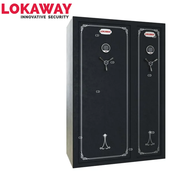 *Garantie 10 ans. (sauf partie électronique=2 ans)Coffre anti-feu 30 minutes à 648°C (double paroi)Conception de fermeture innovante, dissimulation des charnières, cylindres de sécurité en très grand nombre, les coffres Lokaway regroupent ces éléments simples pour faire un coffre d’une sécurité inédite. Coffre-fort Exécutive, pour 24 armes, de marque Lokaway.Equipé du système unique anti-effraction Swing’nSlide.*Voir la vidéo ! -Fermeture Digicode avec clef de sécurité fournie.-14 cylindres de 32mm.-Poignée de porte Design.-Feutrine intérieure grise.-Multiples emplacements de porte.-Etagères et râtelier modulables.-Epaisseur du corps du coffre : 4mm.-Epaisseur de la porte du coffre : 4mm.*Dimensions extérieures : 150 x 102 x 55cm.*Dimensions intérieures : 148 x 98 x 52cm. -Poids : 290Kg.*A savoir sur le système Lokaway Swing’n’Slide anti-effraction :-Le système Swing’n’Slide de Lokaway, système le plus révolutionnaire de ces dernières années, breveté dans plus de 30 pays sur 6 continents, arrive aujourd’hui en France !-Unique en son genre, développé suite à des années de test et une expérience en sécurité engrangé au fur et à mesure du temps, nous pouvons dire aujourd’hui que ce système est le plus sûr en matière de sécurité anti-effraction.-La dissimulation complète des bords de porte empêche tout point d’ancrage de quelques outils qu’ils soient et rend le coffre Lokaway complètement inviolable.
