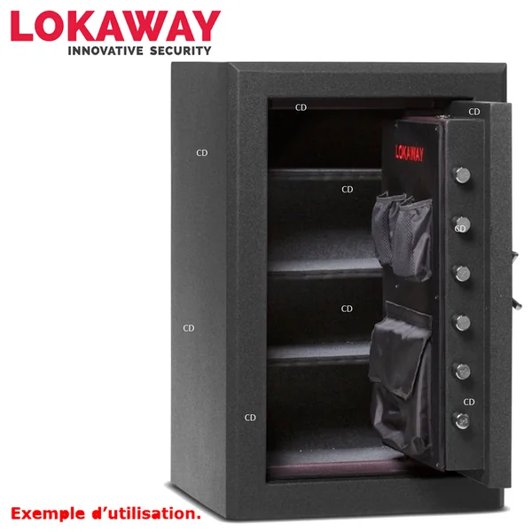 *Garantie 10 ans. (sauf partie électronique=2 ans)Coffre anti-feu, 45 minutes à 648°C.Conception de fermeture innovante, dissimulation des charnières, cylindres de sécurité en très grand nombre, les coffres Lokaway regroupent ces éléments simples pour faire un coffre d’une sécurité inédite. Coffre-fort, série LFC, de marque Lokaway.-Equipé du système unique anti-effraction Swing’nSlide.*Voir la vidéo ! -Fermeture Digicode avec clef de sécurité. -10 cylindres de 32mm. -Poignée de porte Design.-Feutrine intérieure grise.-Epaisseur du corps du coffre : 6mm.-Epaisseur de la porte du coffre : 6mm.*Dimensions extérieures : 95 x 62 x 56cm.*Dimensions intérieures : 94 x 61 x 53cm. -Poids : 148Kg.*A savoir sur le système Lokaway Swing’n’Slide anti-effraction :-Le système Swing’n’Slide de Lokaway, système le plus révolutionnaire de ces dernières années, breveté dans plus de 30 pays sur 6 continents, arrive aujourd’hui en France !-Unique en son genre, développé suite à des années de test et une expérience en sécurité engrangé au fur et à mesure du temps, nous pouvons dire aujourd’hui que ce système est le plus sûr en matière de sécurité anti-effraction.-La dissimulation complète des bords de porte empêche tout point d’ancrage de quelques outils qu’ils soient et rend le coffre Lokaway complètement inviolable.