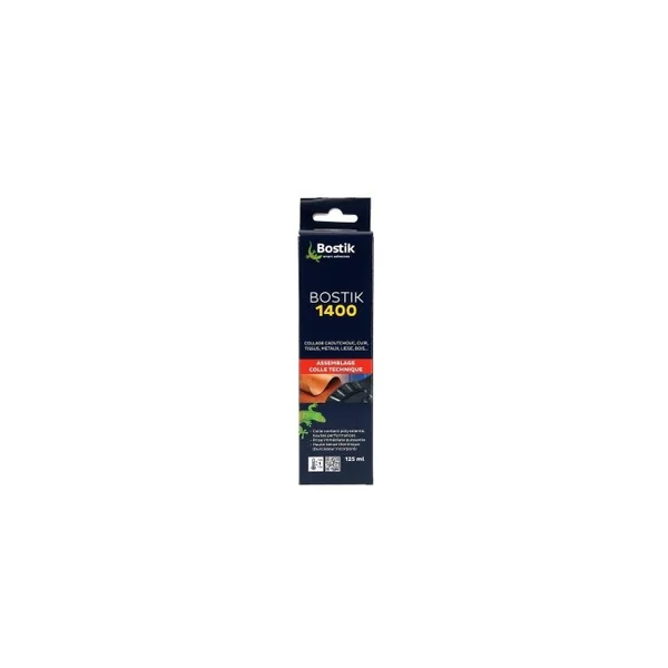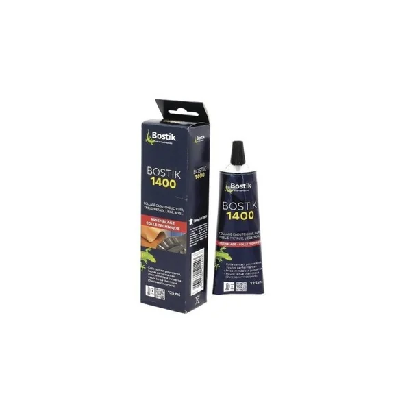 Colle polyvalente hautes performances. Sans toluène.Caoutchoucs, métaux, cuir, liège, tissus, bois, mousses polyéther et polyuréthanne,stratifiés. Caractéristiques Colle 1400 Bostik tube 125ml
