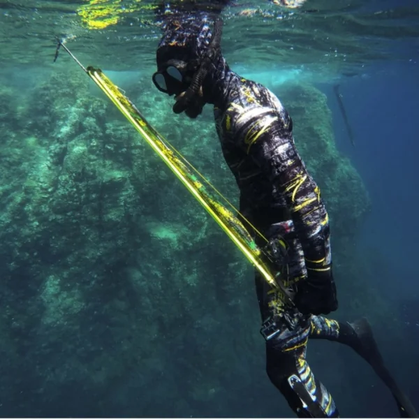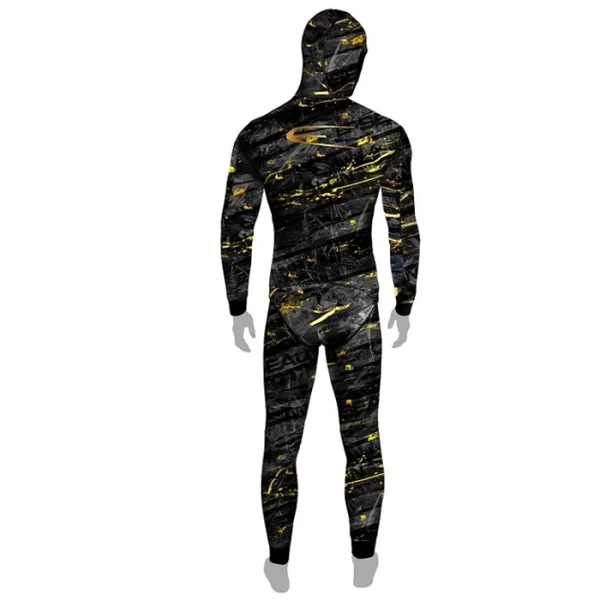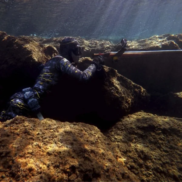 La combinaison de chasse sous-marine Dark Fusion, présente un camouflage distinctif.