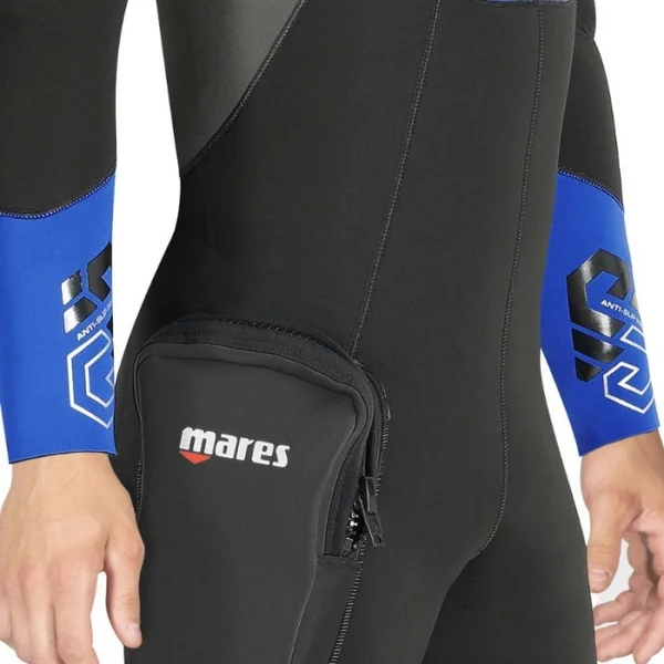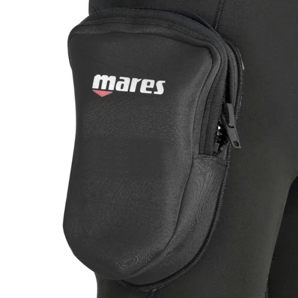 Une poche latérale intégrée sur la cuisse droite permet de ranger les petits accessoires nécessaires lors des plongées, tandis que les poignets dotés de graphismes facilitent la prise en main de l’ordinateur de plongée.