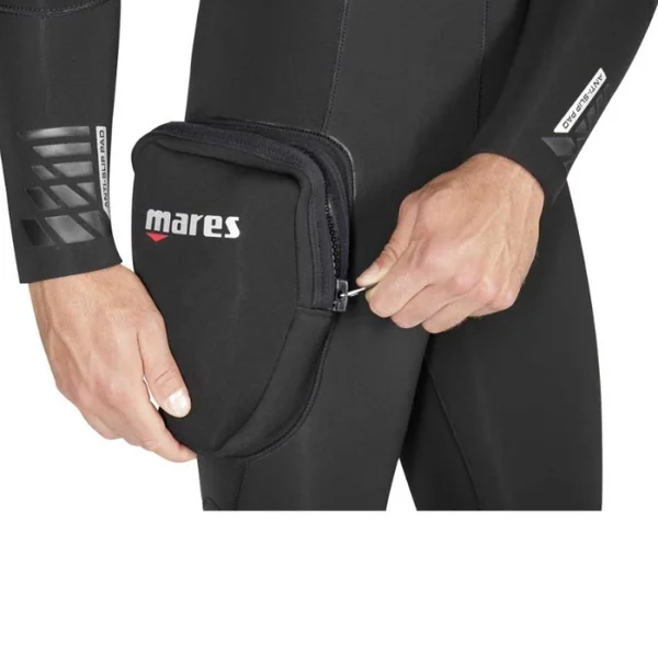 La combinaison dispose également d’une poche zippée sur la jambe droite, équipée d’un passant élastique pour fixer de petits accessoires, offrant ainsi une praticité maximale pour les plongeurs.