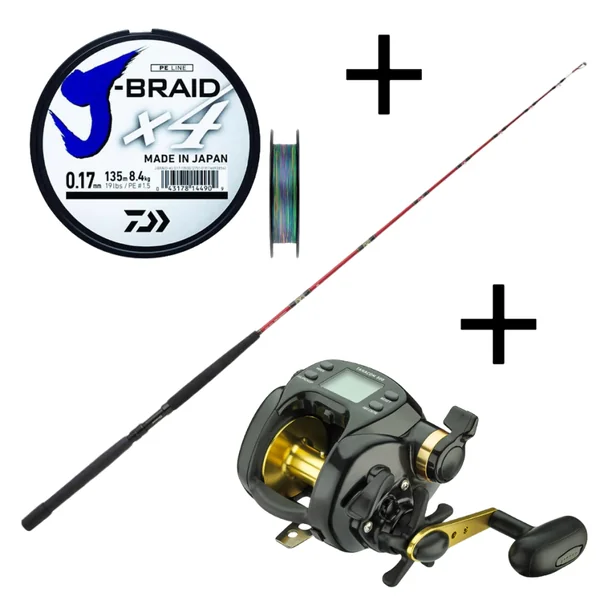 Le combo Tanacom 500 est un pack Daiwa qui se compose d’un moulinet électrique Tanacom de taille 500 équipé d’un frein de 10kg, d’une canne Tanacom d’1m80 pour une puissance de 150 à 800g. Ce pack est vendu avec une tresse de 50 lbs (22,4kg), soit 33/100, en bobine de 500m, multicolore.
