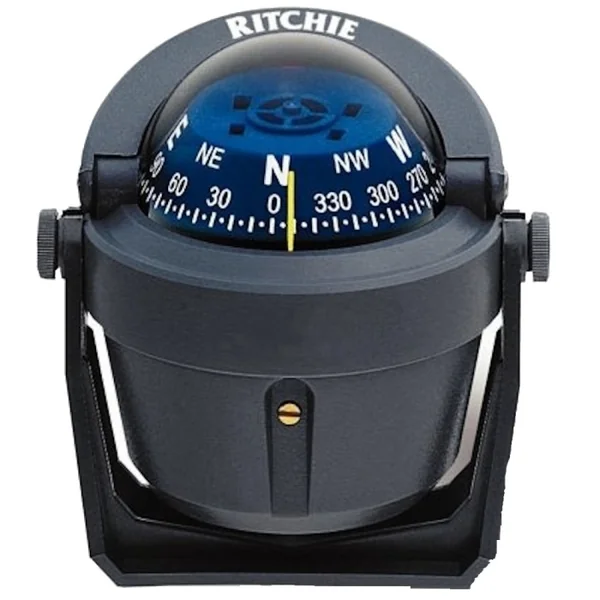 Compas de Navigation Ritchie Sport B-51 avec éclairage Gris Compas de route RITCHIE sur étrier, spécialement conçu pour les bateaux à moteur de 6 à 9 mètres. Il est équipé d’une rose conique de 70 mm offrant une lecture frontale facilitée. Ce compas peut être monté sur un support droit ou incliné grâce à une articulation pratique, idéale pour une installation aisée à bord des embarcations de taille moyenne.