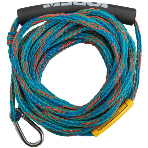 Corde Jobe 1/2 personnes Faire un ride à plusieurs… un vrai régal n’est-ce pas ? Cette corde de traction ultra robuste tire des bouée à 2 riders jusqu’à 1077 KG ! Elles possèdent une forme unique et comprend, également, un flotteur et un mousqueton pour plus de sécurité. Caractéristiques Corde Jobe 1/2 personnes
